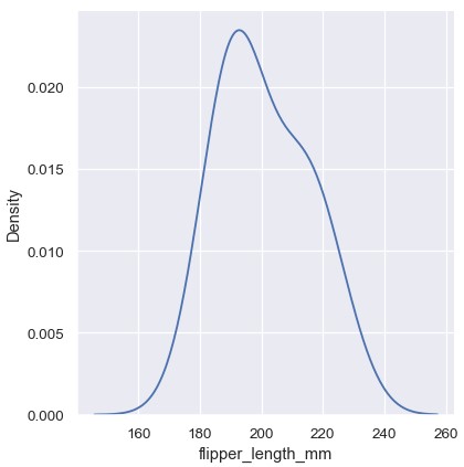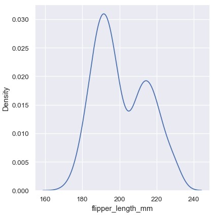 1 | sns.displot(penguins, x='flipper_length_mm', kind='kde') |