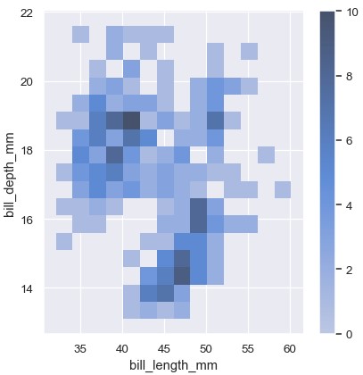 1 | sns.displot(penguins, x='bill_length_mm', y='bill_depth_mm', binwidth=(2, 0.5), cbar=True) |