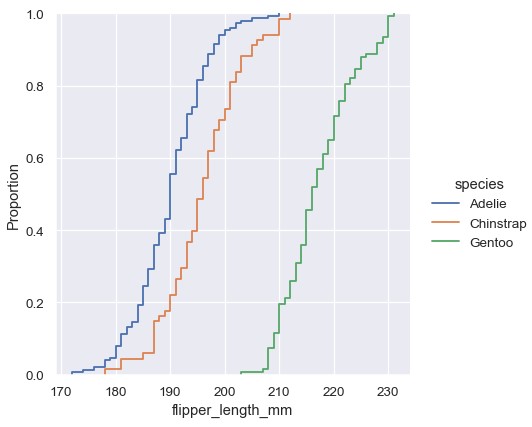 1 | sns.displot(penguins, x='flipper_length_mm', hue='species', kind='ecdf') |