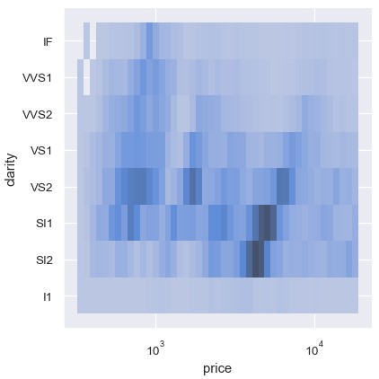 1 | sns.displot(diamonds, x='price', y='clarity', log_scale=(True, False)) |