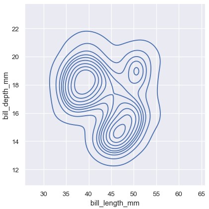 1 | sns.displot(penguins, x='bill_length_mm', y='bill_depth_mm', kind='kde', thresh=0.2, levels=4) |