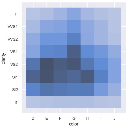 1 | sns.displot(diamonds, x='color', y='clarity') |