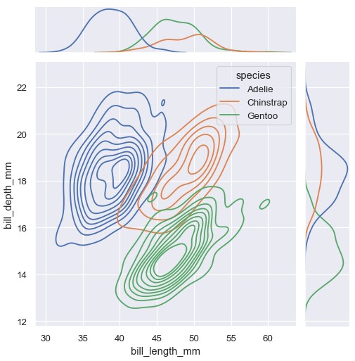 1 | sns.jointplot(penguins, x='bill_length_mm', y='bill_depth_mm', hue='species', kind='kde') |