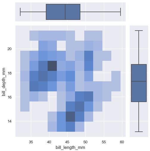 1 | g = sns.JointGrid(penguins, x='bill_length_mm', y='bill_depth_mm') |