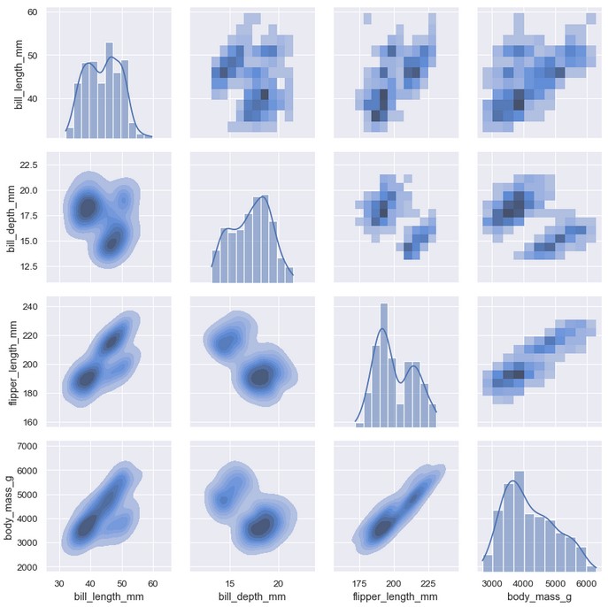 pairplot()函数近似于结合了联合及边缘分布。pairplot()不关注单个相互关系,而是使用小多图的方式,对所有变量的单变量分布和它们两两之间的相互关系同时进行可视化: