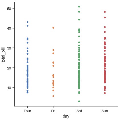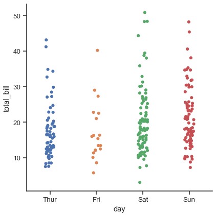 1 | sns.catplot(x='day', y='total_bill', jitter=False, data=tips) |