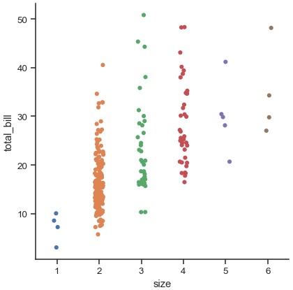 1 | sns.catplot(x='size', y='total_bill', data=tips) |