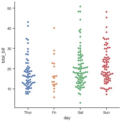 1 | sns.catplot(x='day', y='total_bill', kind='swarm', data=tips) |
