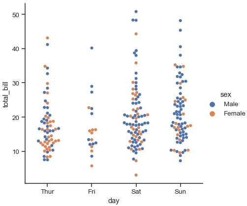1 | sns.catplot(x='day', y='total_bill', hue='sex', kind='swarm', data=tips) |