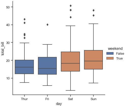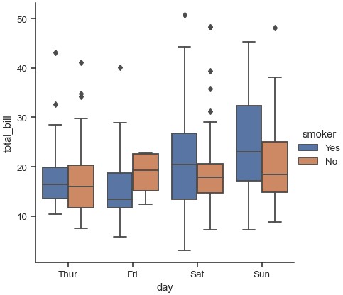 1 | sns.catplot(x='day', y='total_bill', hue='smoker', kind='box', data=tips) |