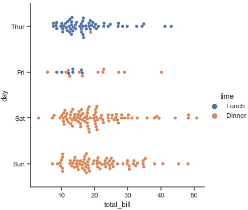 1 | sns.catplot(x='total_bill', y='day', hue='time', kind='swarm', data=tips) |