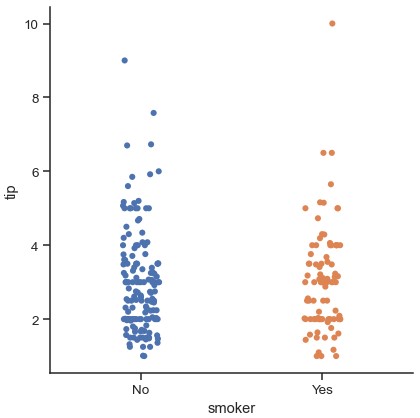 1 | sns.catplot(x='smoker', y='tip', order=['No', 'Yes'], data=tips) |
