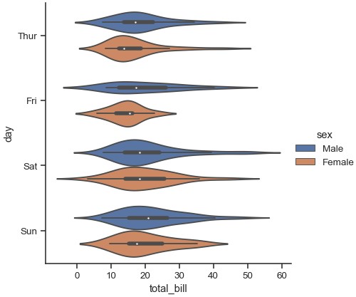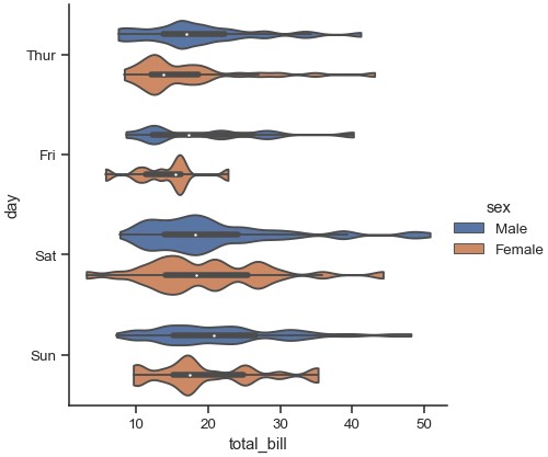 1 | sns.catplot(x='total_bill', y='day', hue='sex', kind='violin', data=tips) |