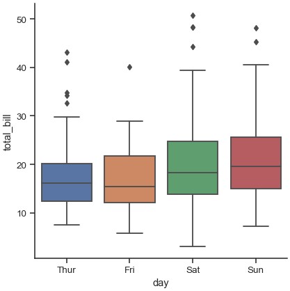 1 | sns.catplot(x='day', y='total_bill', kind='box', data=tips) |