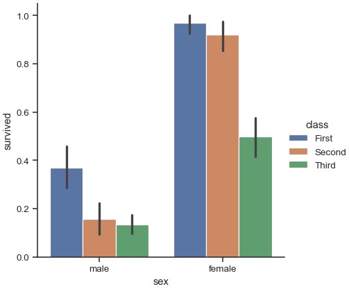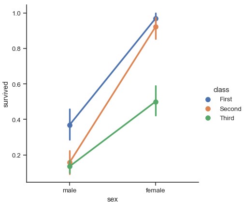 1 | sns.catplot(x='sex', y='survived', hue='class', kind='point', data=titanic) |