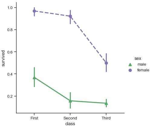 1 | sns.catplot(x='class', y='survived', hue='sex', palette={'male': 'g', 'female': 'm'}, markers=['^', 'o'], linestyles=['-', '--'], kind='point', data=titanic) |