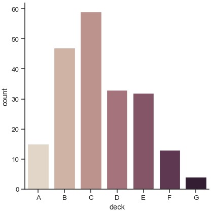 1 | sns.catplot(x='deck', kind='count', palette='ch:.25', data=titanic) |