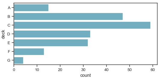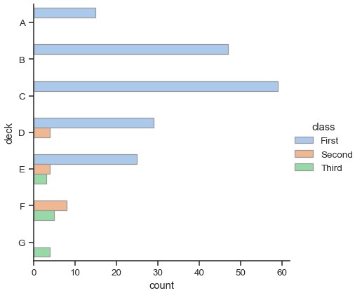 1 | sns.catplot(y='deck', hue='class', kind='count', palette='pastel', edgecolor='0.6', data=titanic) |