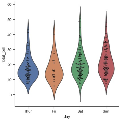1 | g = catplot(x='day', y='total_bill', kind='violin', inner=None, data=tips) |
