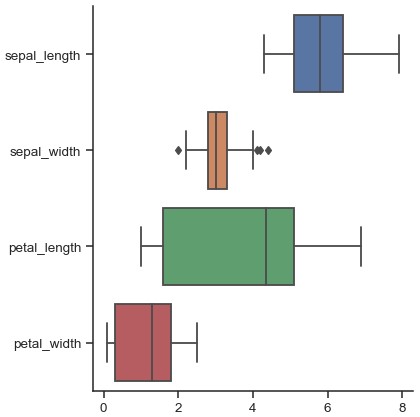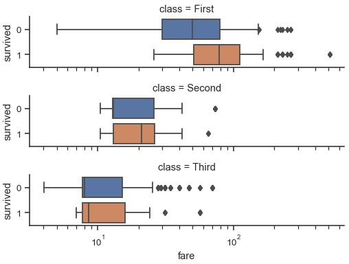 1 | g = sns.catplot(x='fare', y='survived', row='class', kind='box', orient='h', height=1.5, aspect=4, data=titanic.query('fare > 0')) |