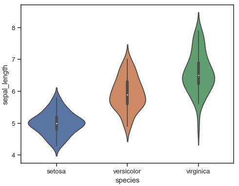 1 | sns.violinplot(x=iris.species, y=iris.sepal_length) |