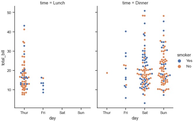 1 | sns.catplot(x='day', y='total_bill', hue='smoker', col='time', aspect=0.7, kind='swarm', data=tips) |