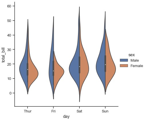 1 | sns.catplot(x='day', y='total_bill', hue='sex', kind='violin', split=True, data=tips) |