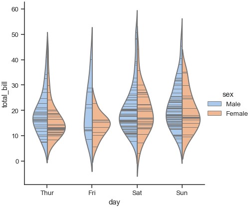 1 | sns.catplot(x='day', y='total_bill', hue='sex', kind='violin', inner='stick', split=True, palette='pastel', data=tips) |