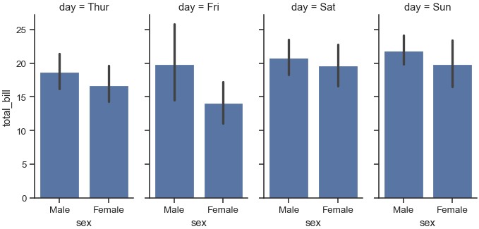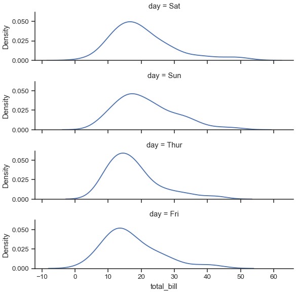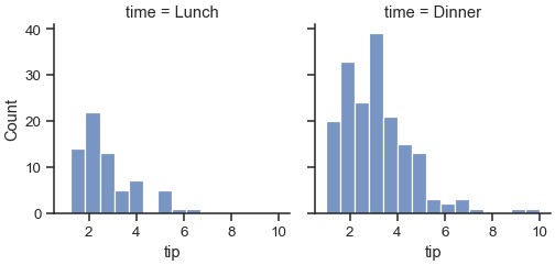 1 | g = sns.FacetGrid(tips, col='day', height=4, aspect=0.5) |