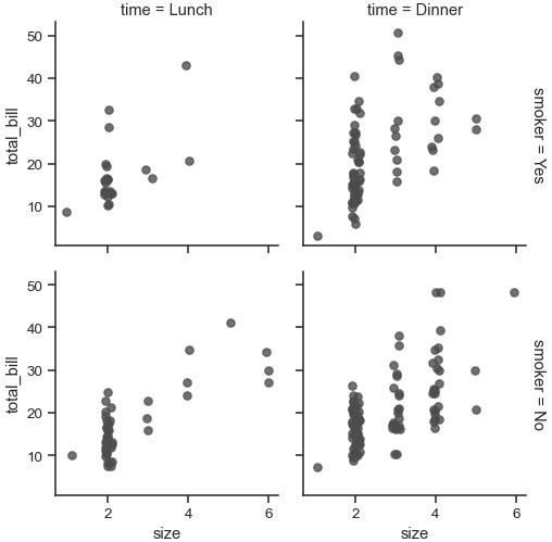 1 | g = sns.FacetGrid(tips, row='smoker', col='time', margin_titles=True) |