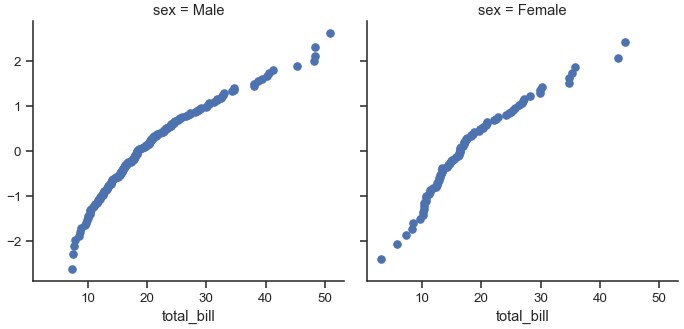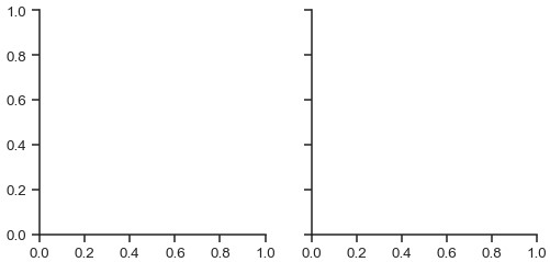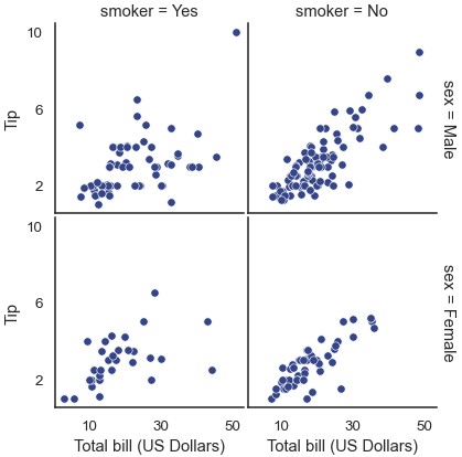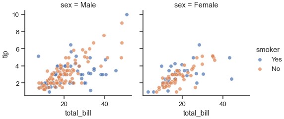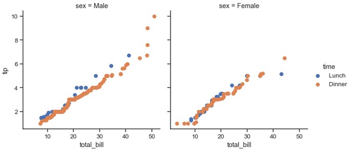 1 | g = sns.FacetGrid(tips, col='sex', hue='smoker') |