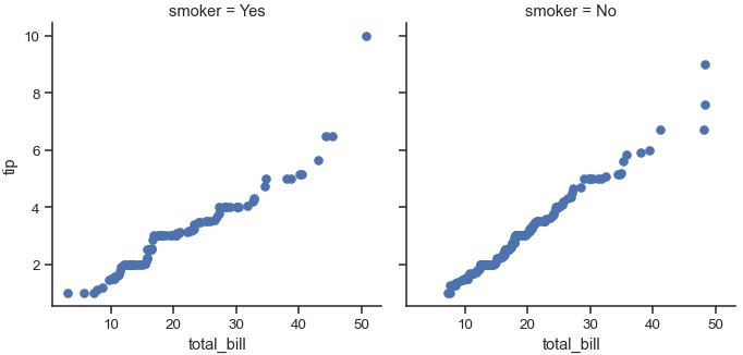 1 | g = sns.FacetGrid(tips, col='smoker', margin_titles=True, height=4) |