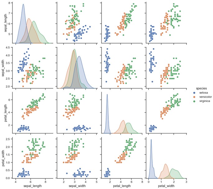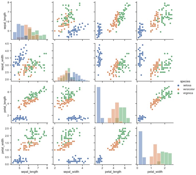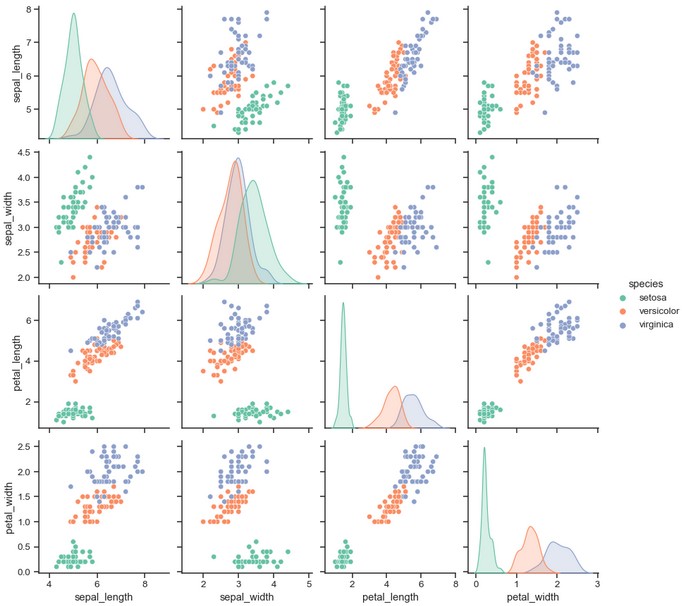 上图的一种常见用法是通过一个单独的类别变量为观测数据填充颜色。例如,鸢尾花数据集包含三个不同的鸢尾花品种,每个品种都有四个测量值,可以看看这三个品种有哪些不同: