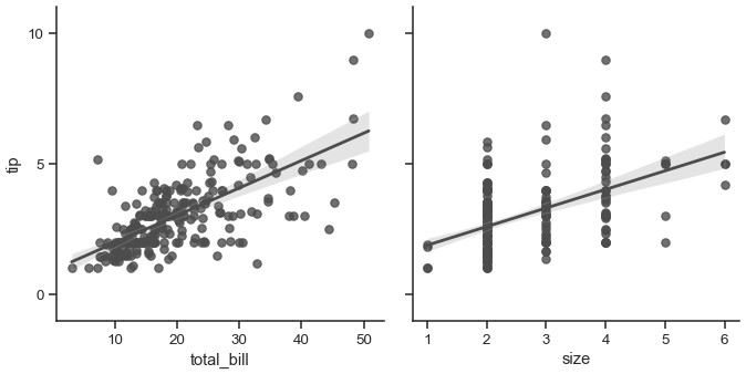 1 | g = sns.PairGrid(tips, y_vars=['tip'], x_vars=['total_bill', 'size'], height=4) |