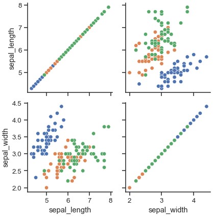1 | g = sns.PairGrid(iris, vars=['sepal_length', 'sepal_width'], hue='species') |