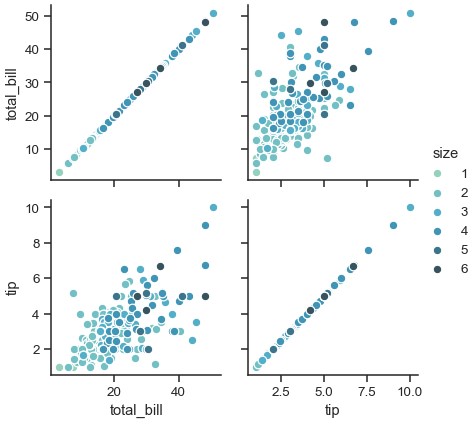 1 | g = sns.PairGrid(tips, hue='size', palette='GnBu_d') |
