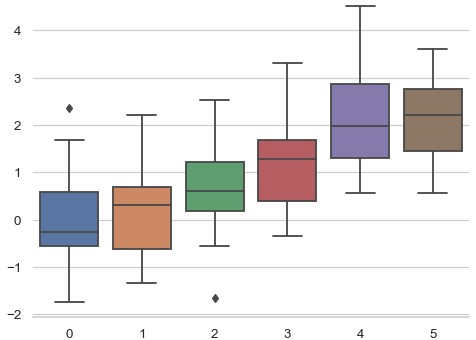 有五种预设的seaborn主题:darkgrid,whitegrid,dark,white,ticks。默认主题是darkgrid。正如上面提到的那样,网格有助于在图上查找定量信息,白灰配色可以避免网格与代表数据的线条发生混淆。whitegrid主题也是类似的,但是更适用于有大量数据元素的图: