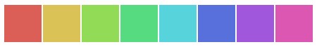 当类别的数量很多时,为它们分配唯一色调最简单的方法是在圆形颜色空间 (保持亮度和饱和度不变,只改变色调)等距地提取颜色。如果要用的颜色数量超出当前调色板中的颜色数量,seaborn会默认采取这种方案