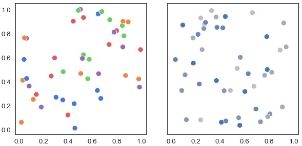 右图中所有点都是蓝色的,只是亮度和饱和度不同,这就很难看出到底有几种类别。我们该怎么讨论其中的某个类别呢?有点蓝但又不是特别蓝的点?另外,灰色的点仿佛要与背景融为一体,看起来不如比较蓝的点突出。如果每个类别都一样重要,这种配色方案就不太好