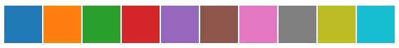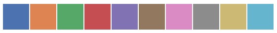 定性的调色板适用于类别型数据,因为主要的差别是色调。Seaborn的默认调色板是定性的调色板,有十个不同的颜色:
