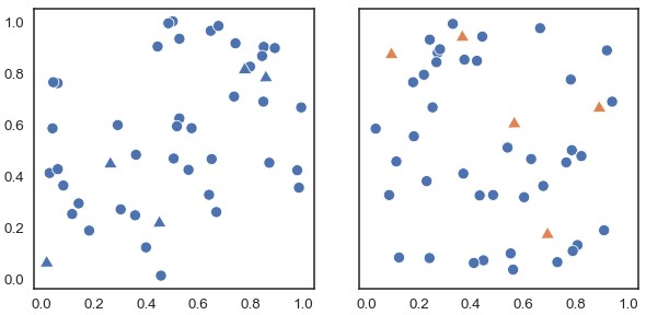 如果想在图中绘制多个类别的数据,通常会改变元素的颜色加以区分。想想这个简单的例子:下面两个图哪个更容易统计三角形的数量: