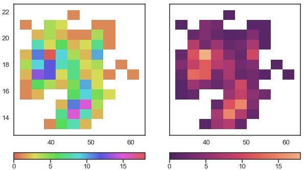然而,色调变化不太适合展示数值型数据。例如,在双变量直方图中用颜色代表计数。左图使用圆形调色板,每个观测的数值变化对应色调的变化。右图使用的调色板用更亮的颜色代表更大的数值: