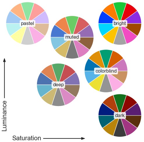 Seaborn有六种matplotlib调色板的变体:deep,muted,pastel,bright,dark,colorblind。这些调色板覆盖了一系列平均亮度和饱和度: