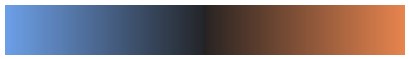 1 | sns.diverging_palette(250, 30, l=65, center='dark', as_cmap=True) |